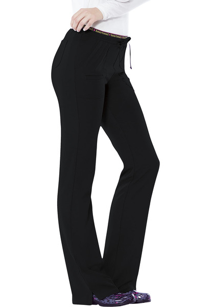 A Contemporary fit, low rise, flare leg pant has raised HeartSoul logo elastic all around waist, a functional drawstring and rounded patch pockets, including a small welt pocket with pink bar tacks. Also featured is an exterior pink bungee loop, a rounded back pocket for additional storage and side vents. Leg Opening 19". Inseam 28". 20110P