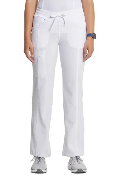 A Contemporary fit, low rise, straight leg pant features an elastic knit waistband and adjustable drawstring. Also featured are rib knit front and back yokes, angled front pockets, front leg seams for detail with a zip closure cargo pocket. One back patch pocket, a bungee instrument loop below left pocket, a bungee cord with a toggle at the leg hems for adjustability with coverstitch detail throughout. Inseam: 28 1/2". The comfortable stretch poplin fabric and super stretchy rib knit is the perfect combo for healthcare professionals. 1123AP