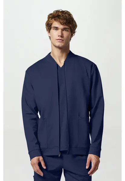 Essential layering with a polished finish. This scrub jacket features a relaxed fit with a stand-up collar and zip-front closure for a clean, professional look. Long sleeves with self-fabric cuffs and a banded hem maintain shape, while two front top-entry patch pockets offer practical storage. A back yoke and subtle contrast bar tack stitching provide added durability for dependable performance on shift. Center back length: 29" CK00036